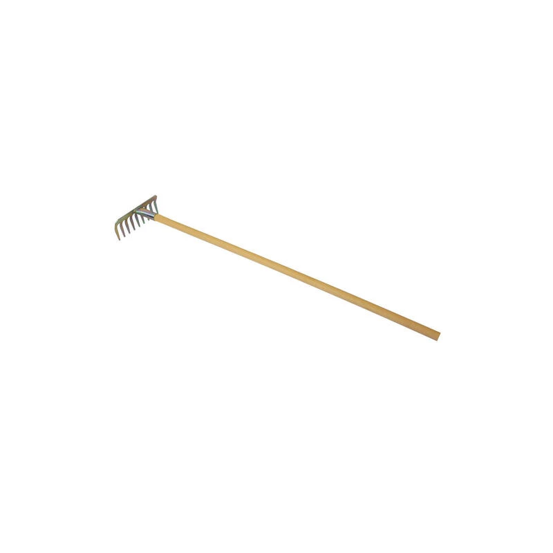 Râteau, métal galvanisé, manche en bois vernis, longueur 100 cm.